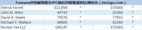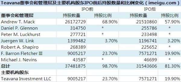 Teavana的SEC文件显示,IPO前公司董事长兼CEO Andrew T. Mack持股68.9%,持股比例最高,IPO后持股比例降至57.9%。