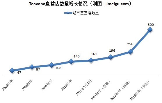 截止2011年5月1日,Teavana在美国35个州拥有161家直营店和19家特许专卖店,计划到2015年年底将商店规模扩张到500家。