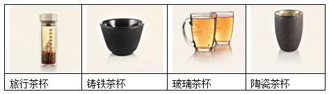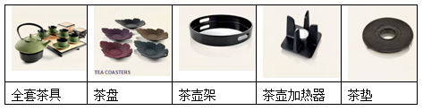 茶具主要是作盛茶、泡茶、喝茶所用。Teavana出售的茶具包括泡茶器、茶水壶、热水机、茶盘、茶壶加热器、茶壶架、茶垫和茶叶罐等,其中泡茶器是以Teavana为品牌,内置专利排水装置。茶水壶和热水机使用该公司自有品牌和第三方品牌。茶盘、茶壶加热器以及茶垫都为手工工艺品,涉及多种款式和颜色。这些茶具价格差异比较大,在4美元至250美元之间。