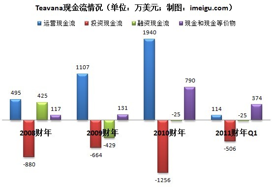 截止2011年5月1日(即2011财年Q1)Teavana手持的现金及现金等级物为374万美元。现金流入主要来源于运营利润和基于不断调整的循环信贷额度的融资,现金流出主要包括资本支出和运营支出两方面。