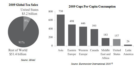 尽管美国近年来茶叶进口量猛增,但跟其他地区相比,茶消费程度仍很低,市场调查公司明特尔(Mintel)最新公布的数据显示 :2009年全球茶市场规模预计在566亿美元左右,而美国国内茶叶市场规模只有52亿美元,占比只有9%。Mintel预期2011~2014年美国茶叶的零售额年复合增长率为6%。