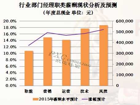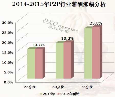 一般来说,薪酬涨幅取决于人才的供需情况,P2P行业起步时间晚,拥有互联网和金融双重背景的人较为缺乏,目前大部分金融相关行业拟涉足互联网业务,这更拉大了人才缺口。据众达朴信《2014年P2P金融行业薪酬福利调研报告》数据显示,2014年,行业整体薪酬涨幅中位值为20.2%,2015年预计涨幅仍处行业领先,保持15%以上。其中,不少核心岗位薪酬涨幅超过30%的现象将持续存在。