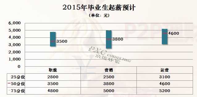 以一线城市为例,预计2015年本科毕业生起薪中位值突破4,500元,其中硕士毕业生将达8,000元,大专中位值达3,000元。职类间薪酬差距也较为明显,技术、研发、运营和风险控制毕业生起薪较高,本科毕业生起薪可以达到5000元,而业务一线则在2500-3000元之间。