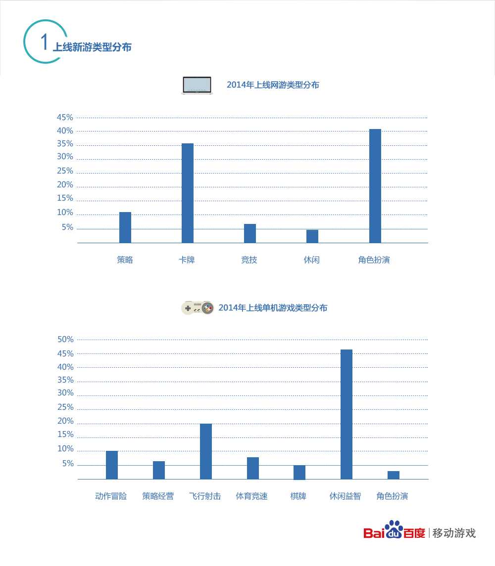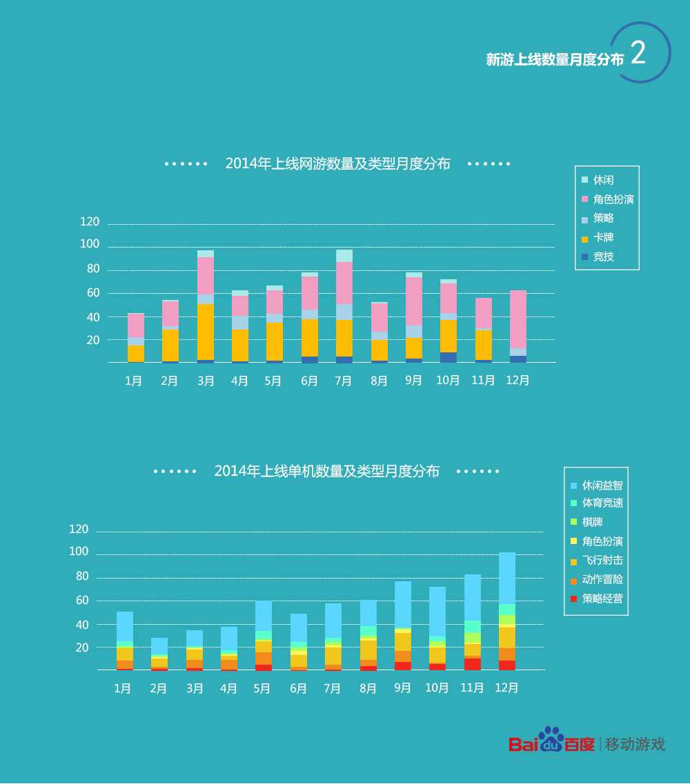 对于手游行业来说,2014年继续高速发展,无论是游戏上线数量还是收入规模,都达到了历史的高峰。日前,国内最大的移动游戏平台百度移动游戏发布了2014年的平台数据,通过从新上线游戏数量及类型、游戏上线月度趋势、收入TOP100、下载TOP100、用户属性等多重数据维度分析,全面展示了百度移动游戏2014年平台上的游戏情况与用户情况,揭示了2015年的趋势,为手游行业从业者提供了宝贵的参考。