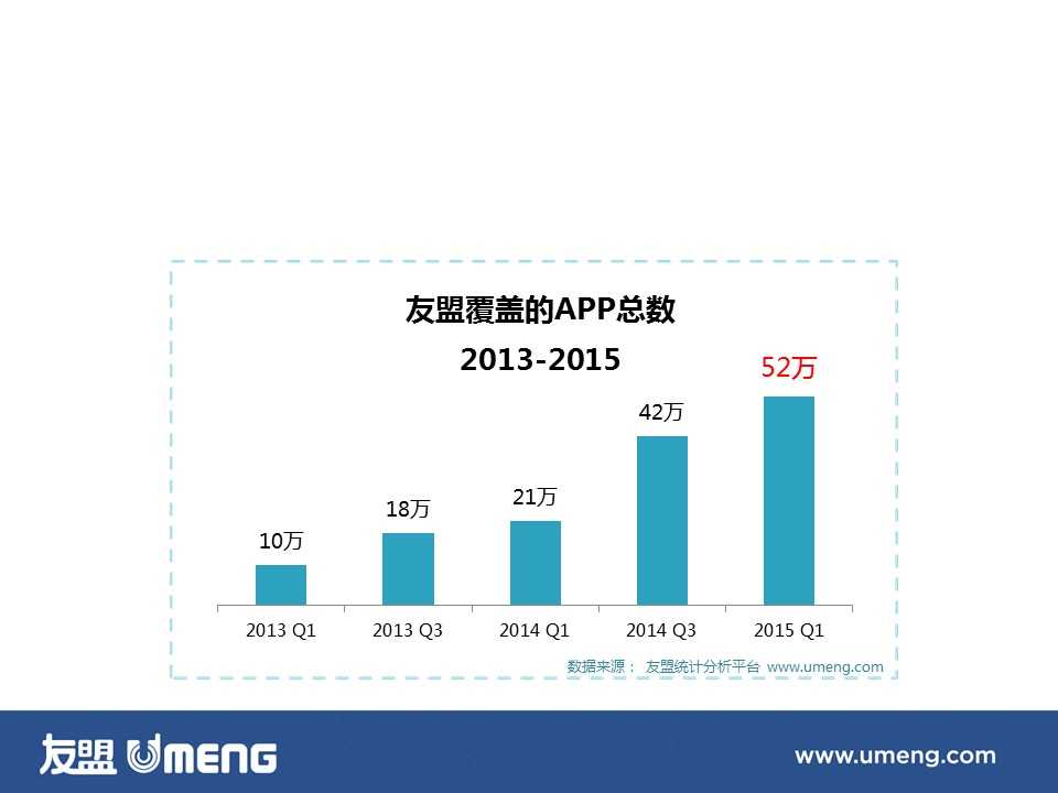 友盟数据分析师任明远提到,目前友盟平台覆盖的 App 量超过 52 万款,相比 2014 年第三季度,增加了 10 万款。不断有新 App 进入用户视野,并渗入到教育、医疗、建筑、农业、服务业等传统领域。