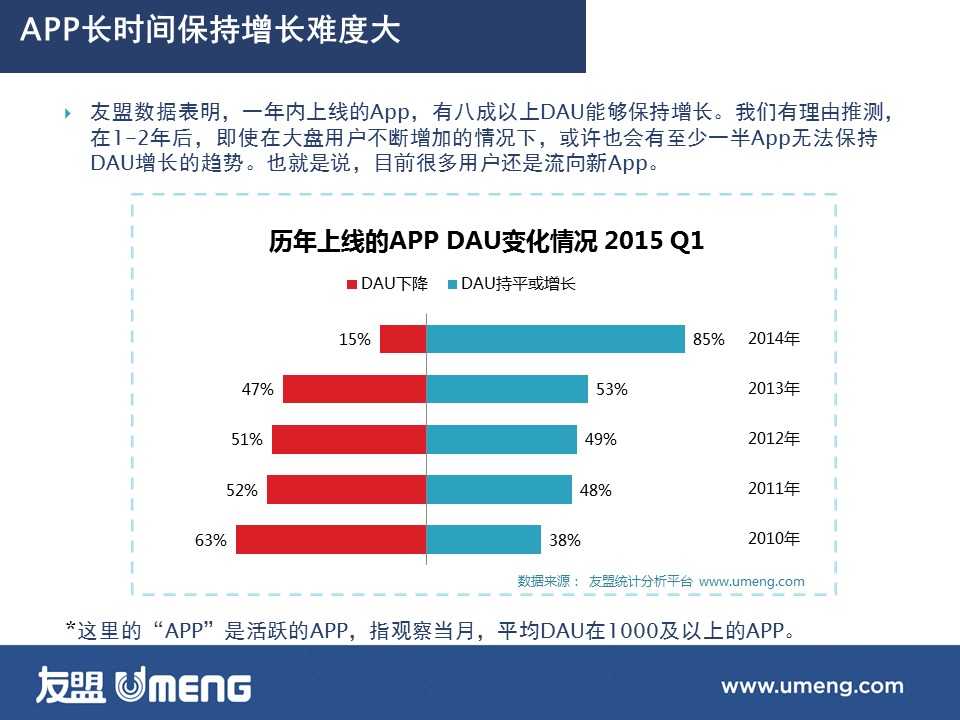 不过除了总量激增,友盟还观察到 App 竞争的一些现状: