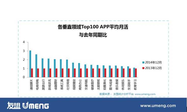此外,App 挤入 Top 100 榜单的难度增大。友盟统计了 2014 年末与 2013 年末主要垂直领域 Top 100 App 的平均 MAU 变化情况 。数据显示,各垂直领域都有显著的增长。可见,想要追赶进入 Top 100 App 榜单的难度远比一年前增加了不少。