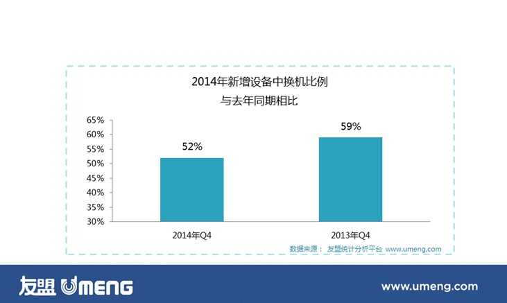 数据显示, 2014 年国内换机设备总量达 3.2 亿。由于 4G 业务的爆发以及iPhone 6, 6 Plus 的发行,导致 2014 年第四季度的换机设备量甚至达到 1.2 亿,在所有新增设备中占比超过 52% 。这意味着,忠诚度不高的用户容易忘记或忽视重新安装 App ,由此 App 可能彻底失去一些长尾用户。