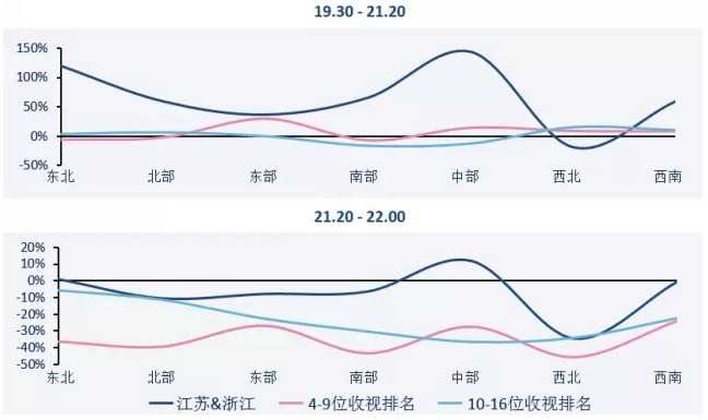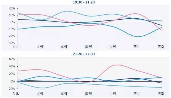 2. 进一步看一下两个黄金时间段,卫视在1930-2120时段在东北,东北,南部,中部地区呈两位数的增长。然而,在2120-2200时段,卫视的收视在所有区域均有下降。央视在除了南部以外的区域获得了大量的观众,这个可能由于一剧两星政策的影响。