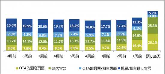 报告建议OTA对购买环节的早期阶段加大关注。该研究将旅行者预订前9周浏览不同网站的比例列举如下。