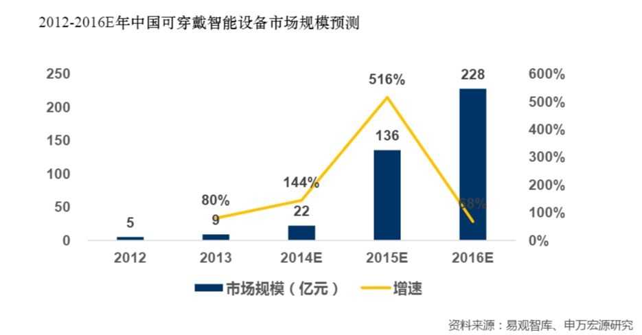 中国智能可穿戴设备市场规模,2014年约为22亿元。
