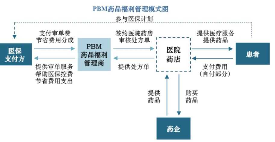 PBM:PharmacyBenefitManagement(药品福利管理公司),在美国医疗产业链中占据重要地位;其帮助医保机构审核医生处方单,降低药品及服务费用,促进合理用药,实行全面健康管理,以提升医疗效率,控制医保支出;并从节省的医保费用中分成获得收益。