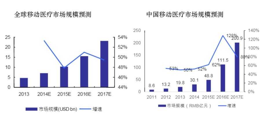 据统计,2014年全球移动医疗市场规模约为70亿美金,中国为30亿人民币
