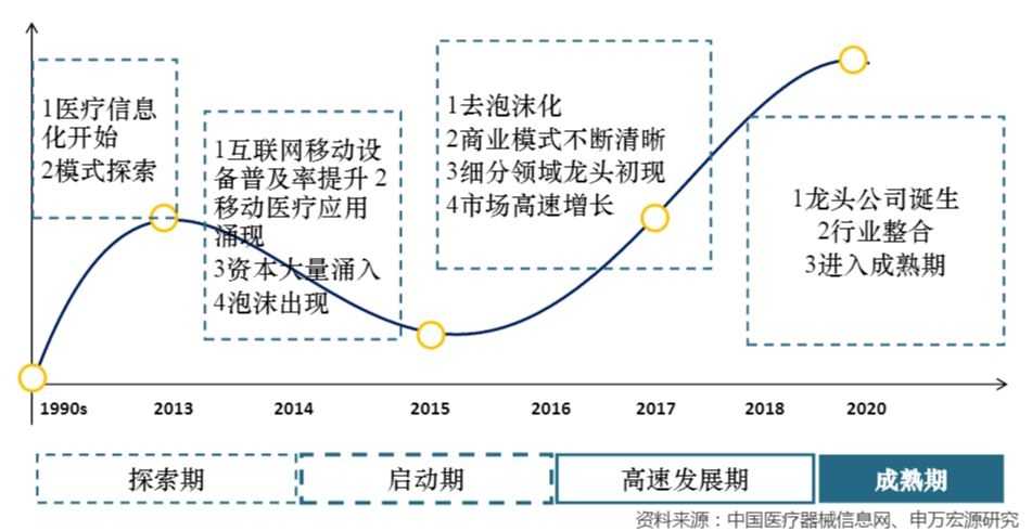 互联网医疗生命周期分为四个阶段:探索期、启动期、高速发展期、成熟期