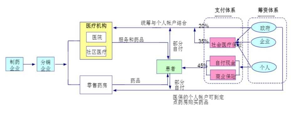 传统医药流通产业链:分为制药、流通、医院/药店、患者、支付方五大环节