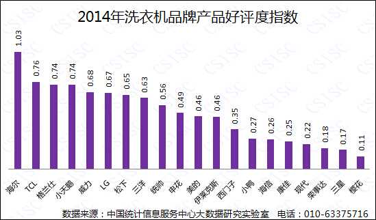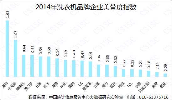 《报告》显示:从2014年洗衣机品牌口碑总体上来看,海尔在多个维度都夺得第一,综合指数获得首位。松下以良好表现获得第二名;小天鹅、三洋并列第三。总体来看,榜单前五名之后的品牌口碑指数未拉开较大差距,呈平缓下降趋势。