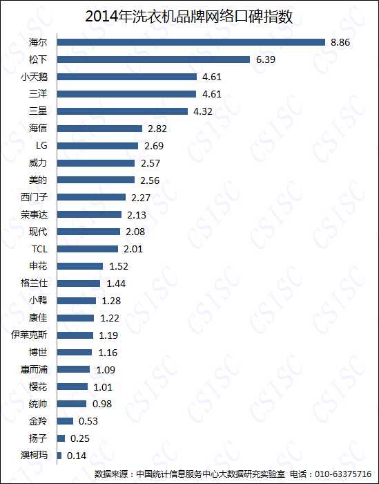 中国统计信息服务中心(CSISC)联合中国质量新闻网发布《2014年度洗衣机品牌口碑报告》(以下简称《报告》),千龙网•中国首都网北京媒体独家授权发布。