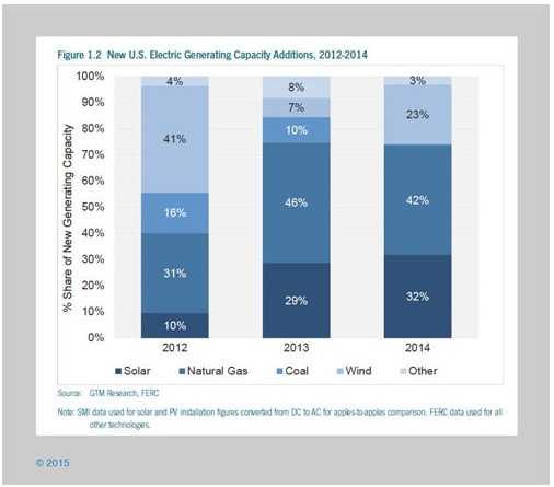 与聚光型太阳能热发电(CSP)的767MW相加,光伏发电在2014年美国新设发电设备总容量(Generating Capacity)中占到了32%。连续两年超过风力发电和煤炭火力发电,份额仅次于天然气火力发电排在了第二位。