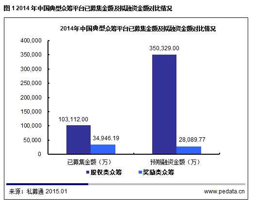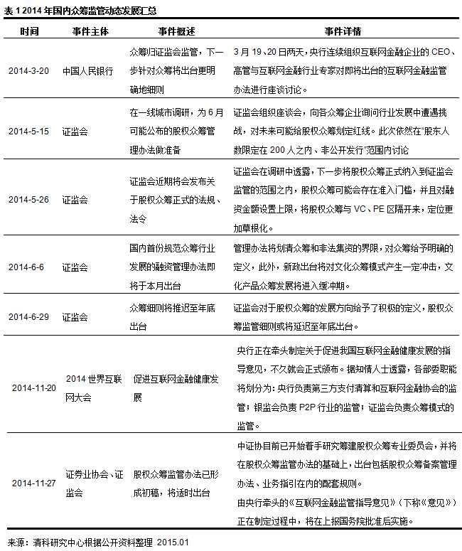 小结:众筹模式在2011年来到中国,一大批众筹网站相继成立并快速发展,互联网金融创新正在改变以往创业投资的传统理念,各类众筹模式的兴起也正日益拓宽大众投资的新兴渠道。2014年11月19日,李克强总理在国务院常务会议上首次提出,“要建立资本市场小额再融资快速机制,开展股权众筹融资试点”。随后,2014年12月18日,中国证券业协会起草了《私募股权众筹融资管理办法(试行)(征求意见稿)》。监管规则的出台将对行业产生促进作用,众多有实力的机构加入众筹行业,进一步扩大众筹市场,点燃众筹创业激情。此外,国内众筹行业的规范化、阳光化也会进一步提升;规范政策的提出,将为众筹行业带来良好的发展机遇,我国众筹行业在2015年将迎来快速健康发展。