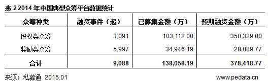 2014年该13家众筹平台预期募资规模37.84亿元人民币,其中奖励类众筹模式预期募资规模2.81亿元人民币,占拟募资规模的7.4%,股权类众筹预期募资规模35.03亿元人民币,占拟募资规模的92.6%。