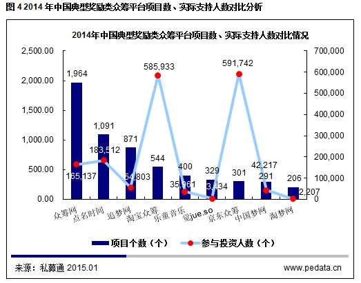 奖励类:目前国内奖励类众筹对项目募集规定如在规定的时间内未能募集到预期资金规模,已募集的资金将退还给投资者,但其实投资者有投资意愿并已经发生了实际的投资行为,由于平台制度问题或未到募集结束时间,该供给行为未能成功,故本部分数据分析采用全部上线项目数据。通过对国内9家奖励类众筹平台的项目数据进行统计,2014年在奖励类众筹网站中,京东众筹、众筹网、淘宝众筹各项数据均领先于其他平台。在项目数量上,众筹网以1,964的项目个数遥遥领先;支持人数低于淘宝众筹和京东众筹;从已募资金额来看,众筹网占比17.6%,众筹网在奖励类众筹平台中发展速度较快。在募集金额上,京东众筹于2014年7月上线,是继供应链金融、消费金融、支付业务及平台业务之后,京东金融推出的第五大业务板块。京东众筹在募资金额上独占鳌头,以1.47亿元人民币的募资金额远远领先于其他平台,上线项目301个,显示出强劲的发展势头。