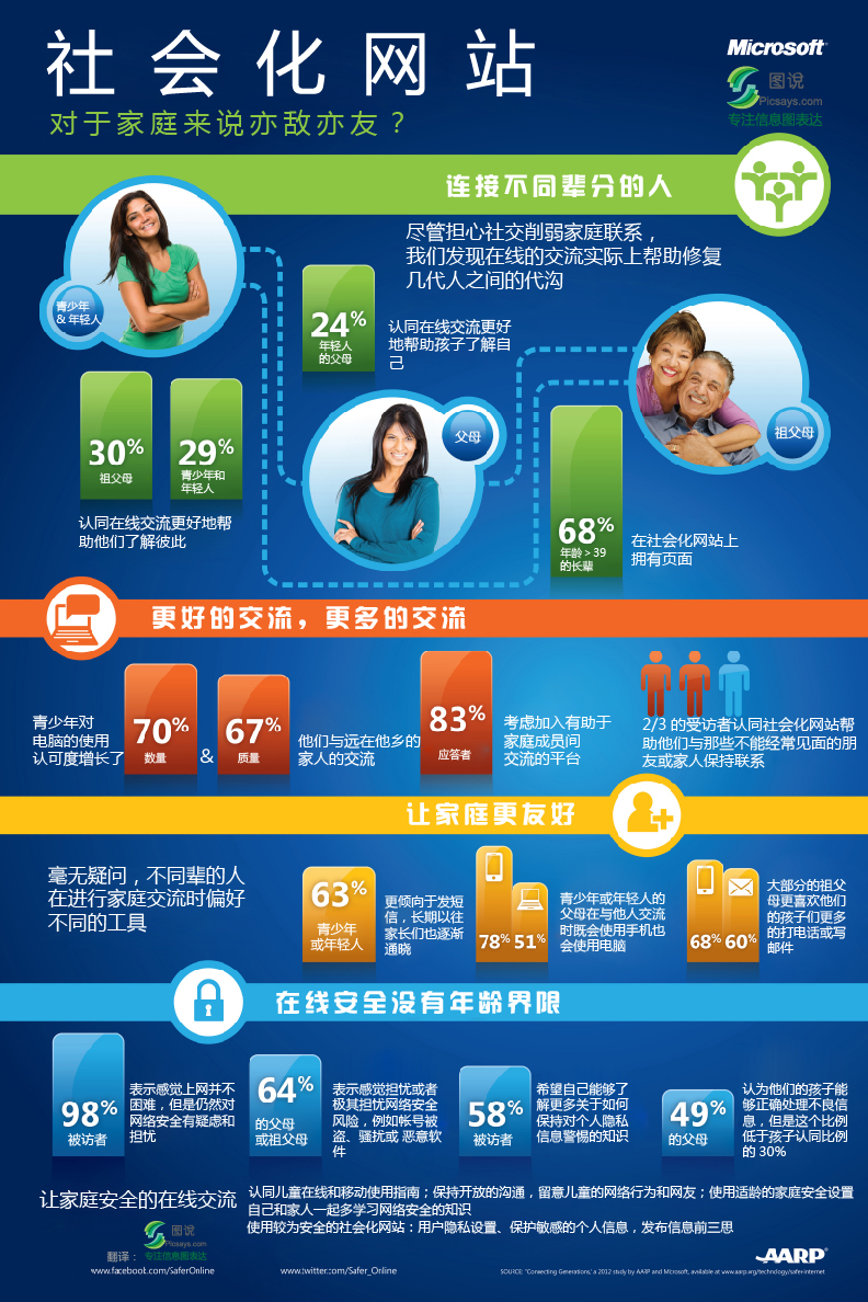 AARP:社会化网站,对家庭来说亦敌亦友?–数据信息图 不同年龄段的人,对社会化网站的接受程度都会不一样。年轻人认为这是交友互动非常棒的平台,那家里的其他成员也这样认为吗?无论老少,都需要加强保护社会化网站上的个人信息,更多的交流、更好的交流,人与人之间才会越来越近。 via:picsays 更多阅读:ODM Group:公司对社会化媒体上负面信息作出回应–数据信息图创业者的社会化媒体营销–数据信息图–中文版社会化电子商务的未来–数据信息图Gopopcorn:社会化媒体60秒所发生数据【数据信息图】从Facebook数据看社会化招聘的重要性–数据信息图Mbaonline:社会化媒体招聘–数据信息图Mindflash:在社会化媒体上找工作–数据信息图国外企业偏爱的社会化媒体和使用原因–数据信息图社会化媒体的ROI(投资回报率)–数据信息图Zendesk:社会化的服务支持–数据信息图AYTM: 社交媒体时代下的品牌与营销之道–数据信息图Flowtown:Facebook上营销的成本–数据信息图Visual:小型企业社交媒体的生存现状–数据信息图Womma:线下和线上的口碑营销–数据信息图社会化媒体的生命周期–数据信息图表