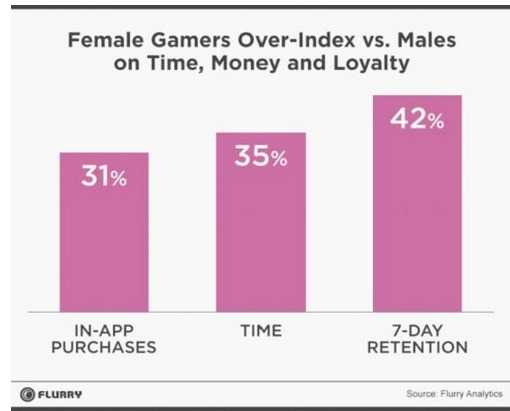 Flurry调查了自己平台上110万个移动设备的游戏,发现女性应用内购买次数比男性多31%。玩手游的时间也比男性多35%,而且平均一周内的游戏忠诚度也比男性高42%。