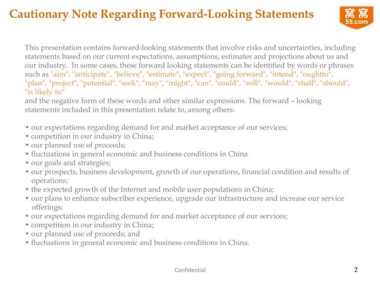 | 警示说明关于前瞻性声明本报告包含前瞻性陈述,涉及风险和不确定性,包括基于我们目前的预期,假设,估计和对我们和我们的行业预测的陈述。在某些情况下,这些前瞻性声明可以通过单词或短语,如“目标”,“预期”,“相信”,“估计”,“期望”,“前进”,“打算”,“oughtto”标识, “规划”,“工程”,“势”,“寻求”,“也许”,“可能”,“可以”,“可能”,“将要”,“将要”,“应该”,“应该”,“是。有可能“与这些词和其他类似表达的否定形式向前 – 包括在此演示文稿的前瞻性陈述涉及到,其中包括:•我们对需求和市场接受我们服务的期望;•竞争在我们这个行业在中国;•我们计划使用募集资金;•波动总体经济和商业环境在中国•我们的目标和战略;•我们的前景,企业的发展,我们的业务,财务状况和经营业绩的增长;•互联网的预期增长和移动用户群在中国;•我们的计划,以提高用户体验,改善我们的基础设施,并提高我们的服务产品; •我们对需求和市场接受我们服务的期望; •我们在中国的产业竞争力;•我们计划使用募集资金; 和•波动总体经济和商业环境在中国。2机密 |