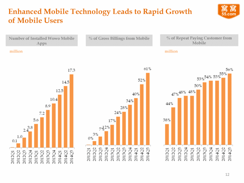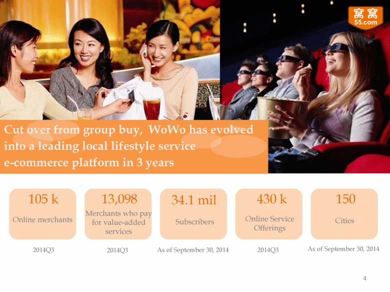 | 105 K.在线商家13098招谁支付430ķ城市150 2014Q3 2014Q3截至9月30日,2014年2014Q3截至9月30 2014年从团购切换到增值服务的用户34.1万在线服务产品,窝窝已发展成为领先本地生活服务的电子商务平台,在3年内4 |