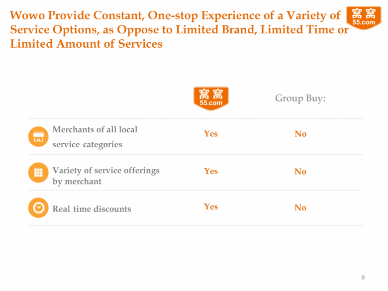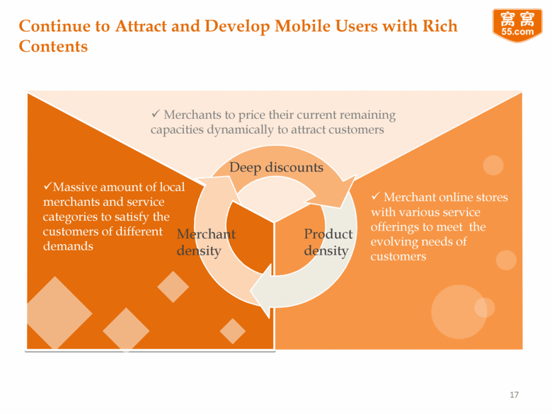 | 继续吸引和发展移动用户提供丰富的内容深折扣商家密度产品密度招商动态定价他们目前的剩余容量,以吸引顾客的本地商家和服务类别巨量,以满足不同的需求,商家的网上商店的客户提供不同的服务产品,以满足客户17不断变化的需求 |