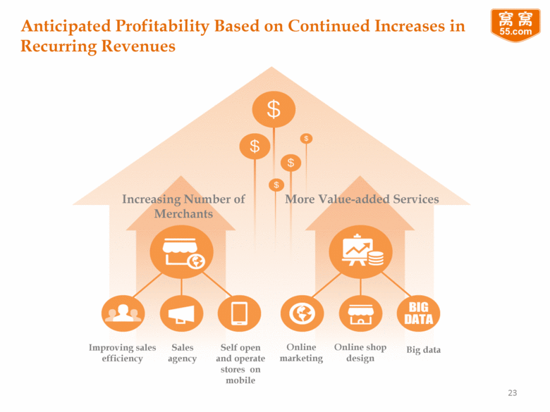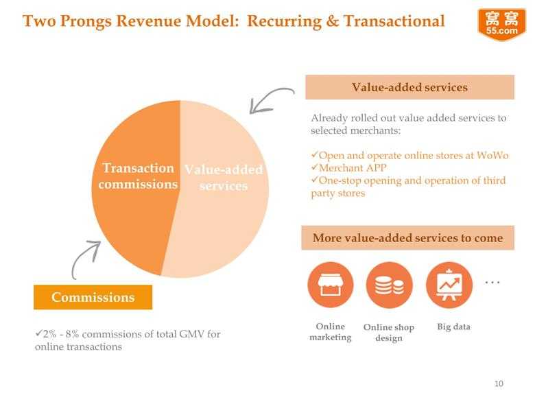 | 增值服务委员会更多的增值服务来已推出的增值服务,以选定的商家大数据网上商店设计网络营销交易佣金增值服务:打开并运行的网上商店在喔喔商家APP一站式开通运营第三方商店的2% – 总GMV的8%的佣金网上交易两个插脚收入模式:经常性和交易10 |