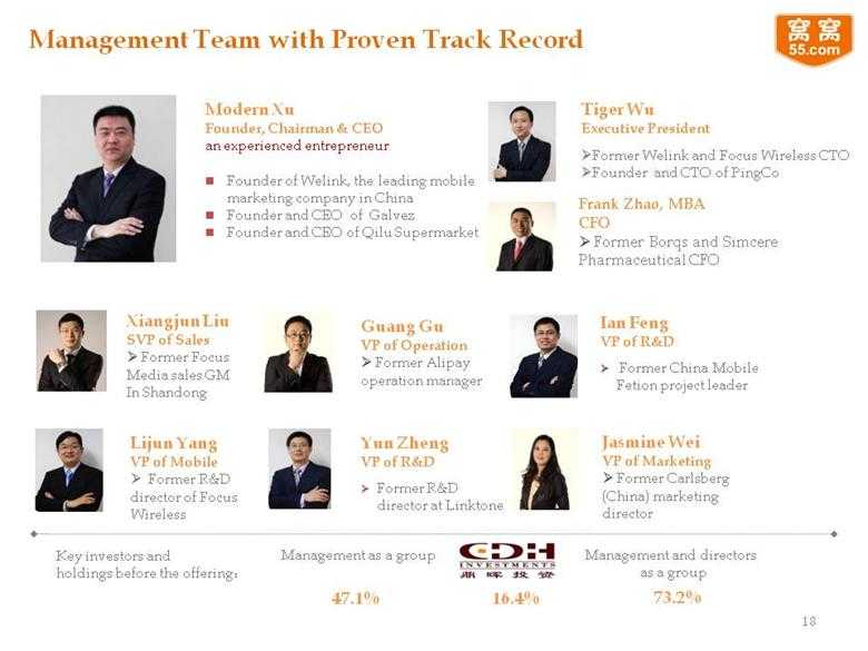 | 弗兰克·赵,MBA CFO前播思通讯和销售前分众传媒销售GM先声药业CFO刘向军SVP在营销前嘉士伯的研发曾任中国移动飞信项目负责人茉莉花威副总裁操作前支付宝运营经理伊恩·冯副总裁山东光谷副总裁(中国)市场总监管理与公认的成绩记录虎伍行政总裁前Welink和分众无线CTO创始人兼CTO PingCo的云铮的R VP&D原研发总监移动原R&分众无线的主要投资研发总监的掌上灵通杨丽君副总裁和团队持有本次发行前:47.1%管理作为一组16.4%的现代徐创始人,董事长兼首席执行官Welink,领先的移动营销公司在齐鲁超市18管理和董事加尔韦斯创始人兼CEO,作为中国的创始人和CEO的经验丰富的企业家创办人一组73.2% |