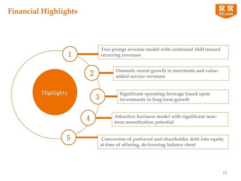 | 亮点二戏剧近期的增长在商家和增值服务收入根据与显著近期货币化潜力的两个插脚收入模式转变的持续长期增长4有吸引力的商业模式投资3巨大的经营杠杆对经常性收入1转换的首选和股东债务转为股权的产品,去撬动资产负债表5财务摘要时间19 |