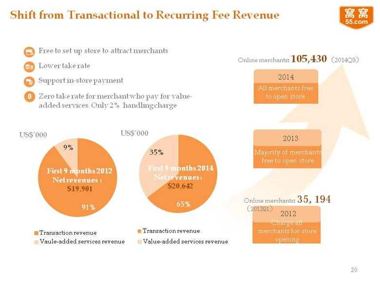 | 前9个月2014年净营业收入:20642美元年前9个2012净收入:19901美元转变,从交易到经常性使用费收入的20千美元千美元在线商家:105430(2014Q3) 2014年2013在线商家:35194(2012Q1)2012随意打开自由开免费店设立专卖店,以吸引商家商家店面广大客商支持店内支付较低的利率需要采取零利率的商人谁付费的增值服务。只有2%的手续费0充电所有商户的店开业 |