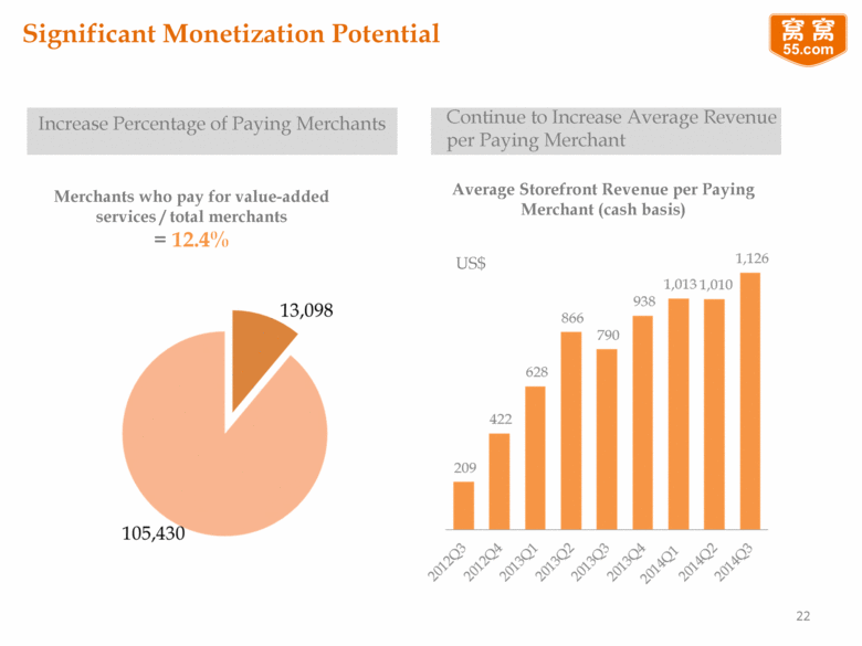 | 显著货币化谁支付增值服务/总商人潜在招商= 12.4%,美元支付的增加招商的百分比继续每支付商户店面的平均收入每支付商户(现金收付制)22 13098 105430 209 422 628 866 790提高平均收入938 1013 1010 1126 |