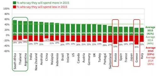 调查还发现:俄罗斯和希腊是减少旅游预算比例最高的两个国家,分别为 33%和 35%(平均水平为23%)。前者是因为受到西方国家的制裁以及卢布下跌的影响,而后者则是由于紧缩政策及欧元贬值的双重压力。