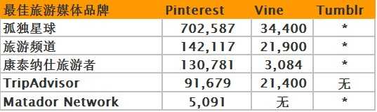 尽管Tumblr的用户群更大,但是拥有官方账户的品牌数量最少。康泰纳仕旅游者、Matador Network和旅游频道在平台上最吸引人,但是用户却并不买账,至少现在没有什么有意义的方式。