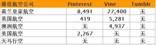 美国著名科技媒体Skfit,近日在最活跃的社会化媒体版块中,分析评价了部分品牌推动的社会化活动,和以图片为基础的网站,比如Pinterest、Vine和Tumblr上活动做对比。在前五名的航空公司、预订网站、目的地、酒店和媒体品牌中,75%出现在Pinterest中,70%出现在Vine上,30%出现在Tumblr上。