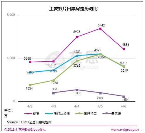 据EBOT艺恩日票房智库数据显示,内地电影市场2015年第13周(3.30-4.5)周总票房超6.8亿,环比上升41%。《战狼》4天超2亿夺冠;《王牌特工》1.9亿居第二位,累计约3.5亿;《咱们结婚吧》4天进账1.4亿;《暴疯语》3天仅入2712万;《失孤》累计超2.1亿;多次改档的《绝命逃亡》3天仅1109万,市场表现惨淡;《冲锋车》3天仅978万。
