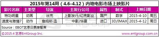 据EBOT艺恩日票房智库显示,下周(4.6-4.12)仅有2部新片上映,是2015年前四个月中新片最少的一周:来势汹汹的《速度与激情7》和徐克导演的动画片《特功明星》,不过此徐克非彼徐克,这个徐克不是香港的“徐老怪”徐克,而是北京一个专门拍动画片的年轻导演“小徐克”。