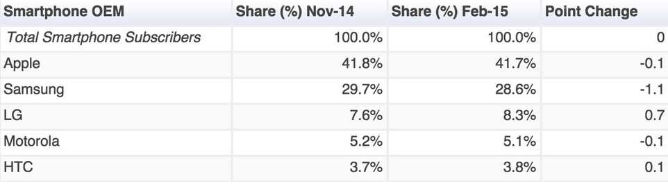 本周,著名信息分析公司comScore联合MobiLens发布了最新的美国移动市场报告。调查涵盖的数据从2014年12月截至2015年二 月份,据调查显示,在美国移动市场苹果的硬件设备以41.7%占有率位居第一,三星以28.6%排第二。从移动系统来看,采用谷歌安卓系统的设备占总量的 52.8%,超过苹果iOS系统的41.7%。