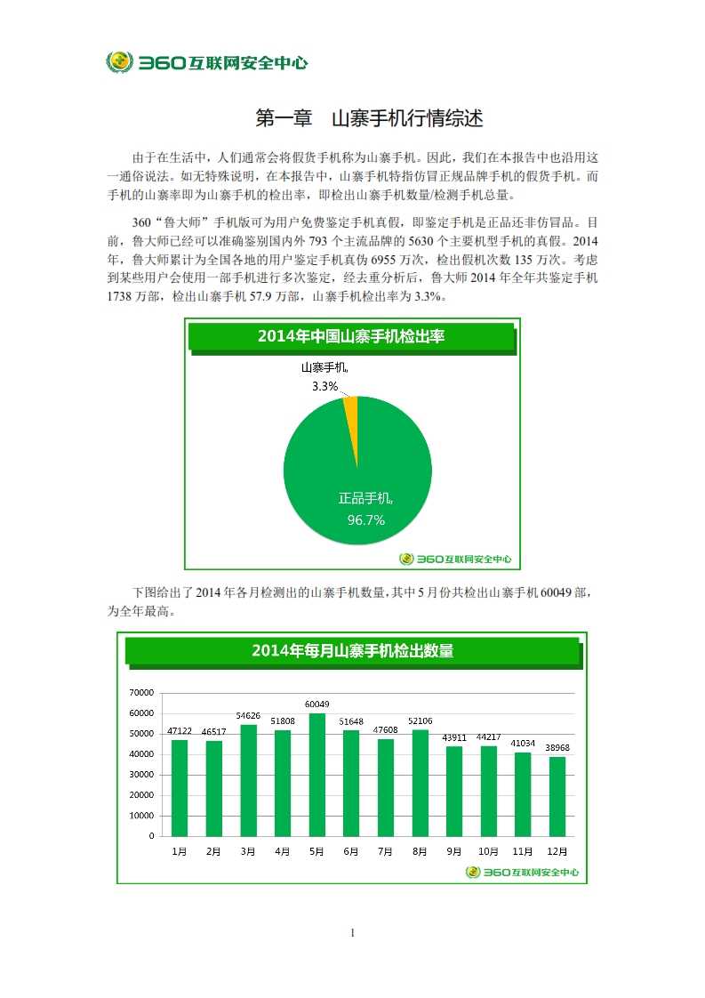 * 2014年,鲁大师共帮助用户鉴定手机1738万部,检出山寨手机57.9万部,手机山寨率为3.3%。