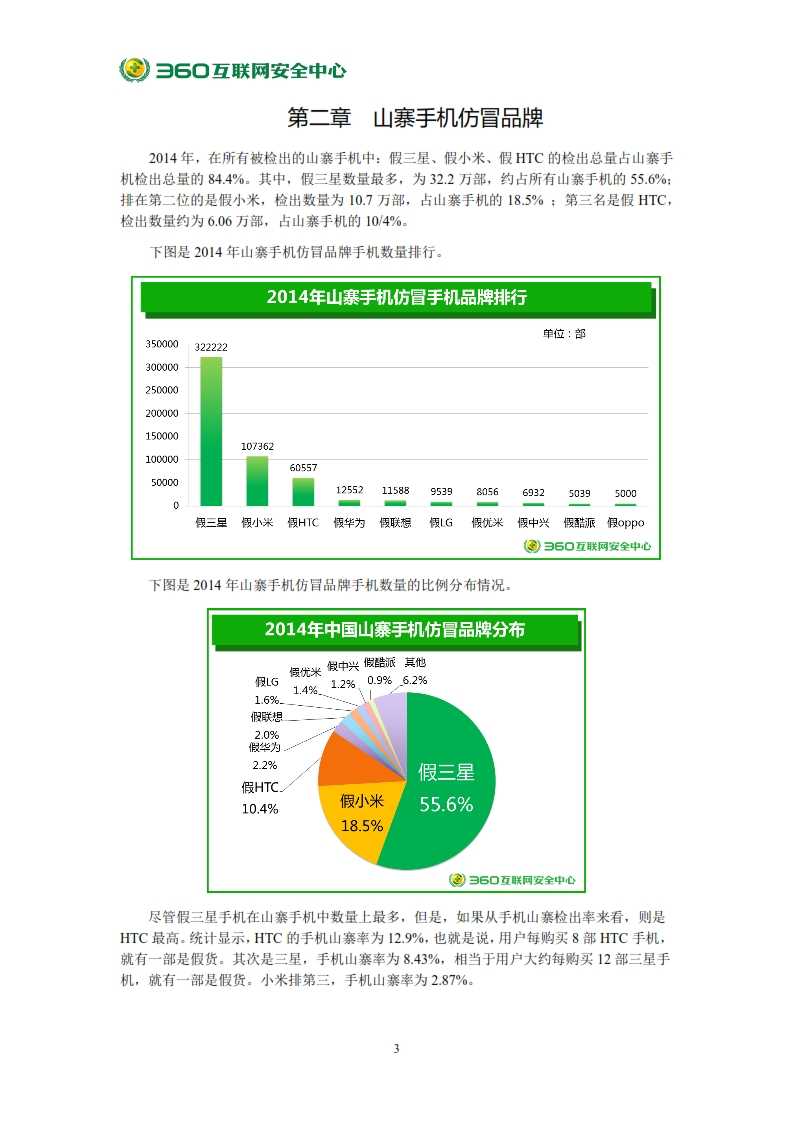 * 假三星、假小米、假HTC的检出总量占山寨手机检出总量的84.4%。其中,假三星数量最多,为32.2万部,约占所有山寨手机的55.6%;排在第二位的是假小米,检出数量为10.7万部,占山寨手机的18.5% ;第三名是假HTC,检出数量约为6.06万部,占山寨手机的10/4%。
