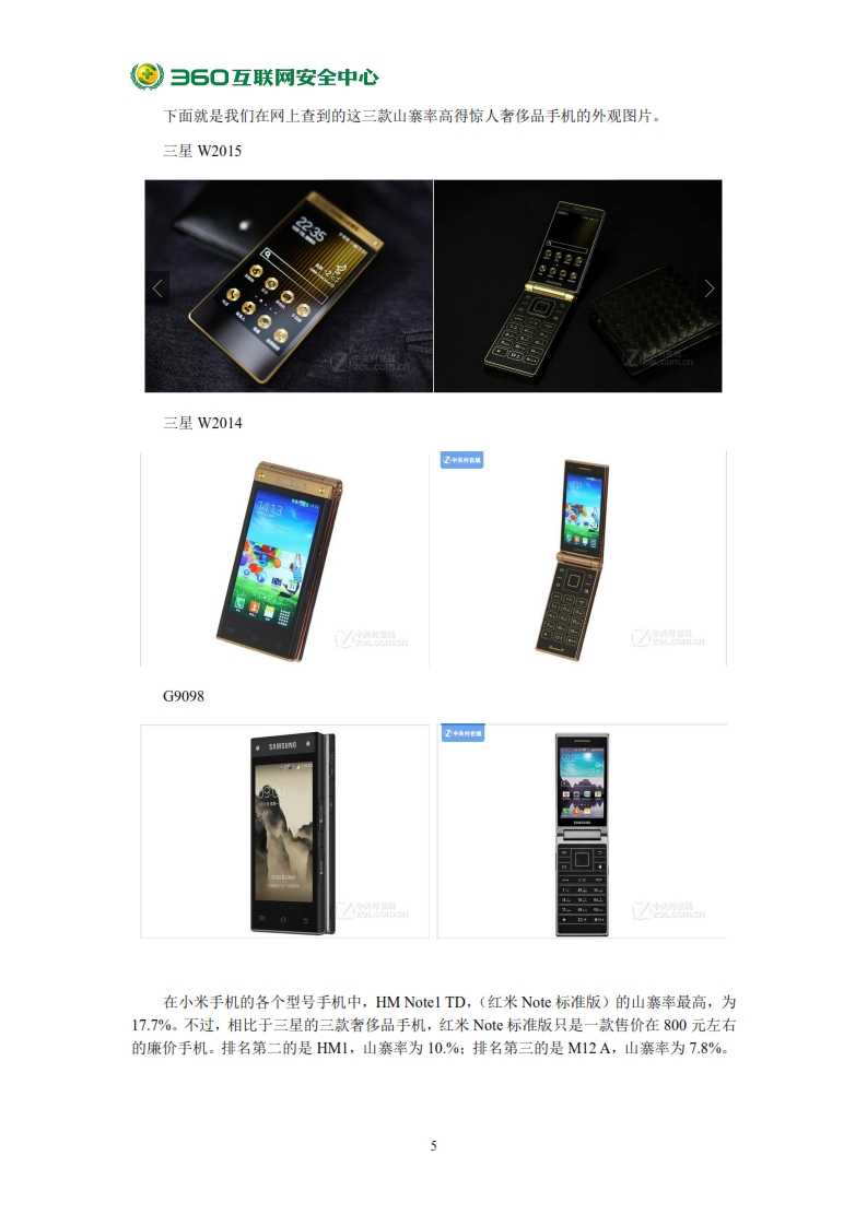 * 三星各型号手机中,W2015的山寨率最高,达到了惊人的94.3%。也就是说,如果有100个人购买这款手机,至少有94个人买到的是假货。其次是W2014,山寨率为64.7%;排名第三的是G9098,,山寨率为52.3%。有趣的是:这三款手机均为售价在8000元至3万元的奢侈品手机。