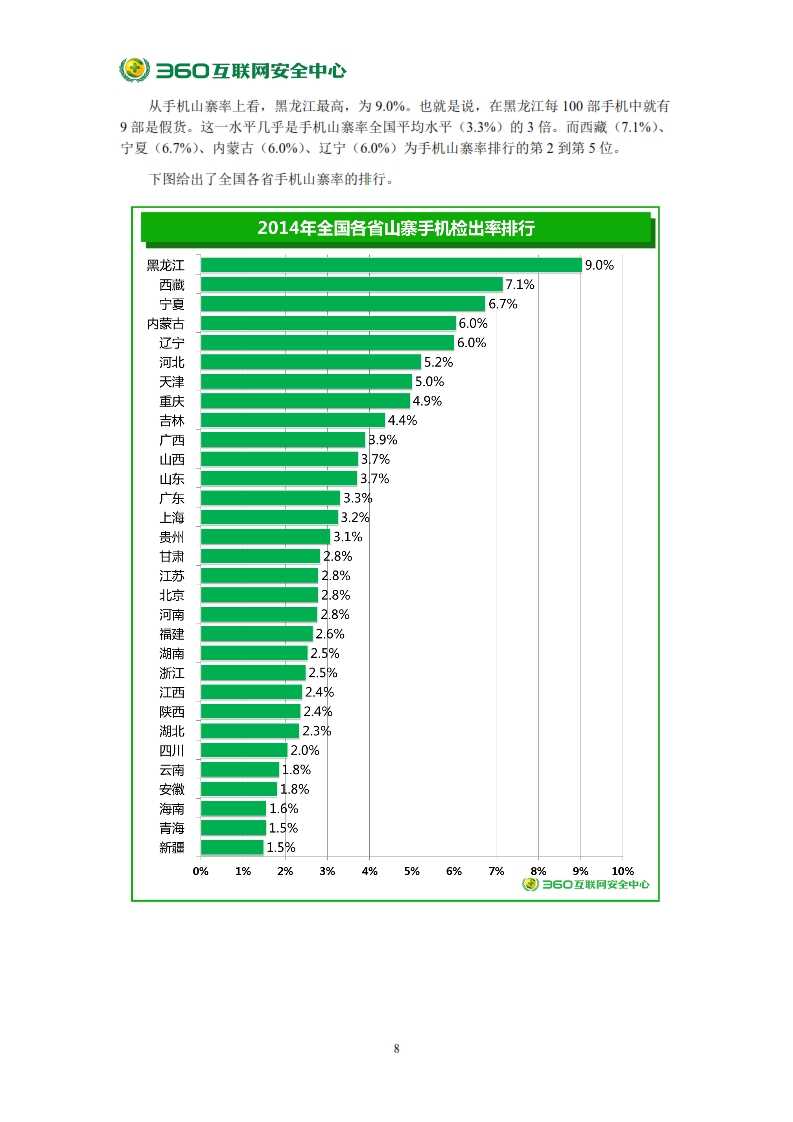 * 从山寨手机检出率上看,黑龙江最高,为9.0%。也就是说,在黑龙江每100部手机中就有9部是假货。