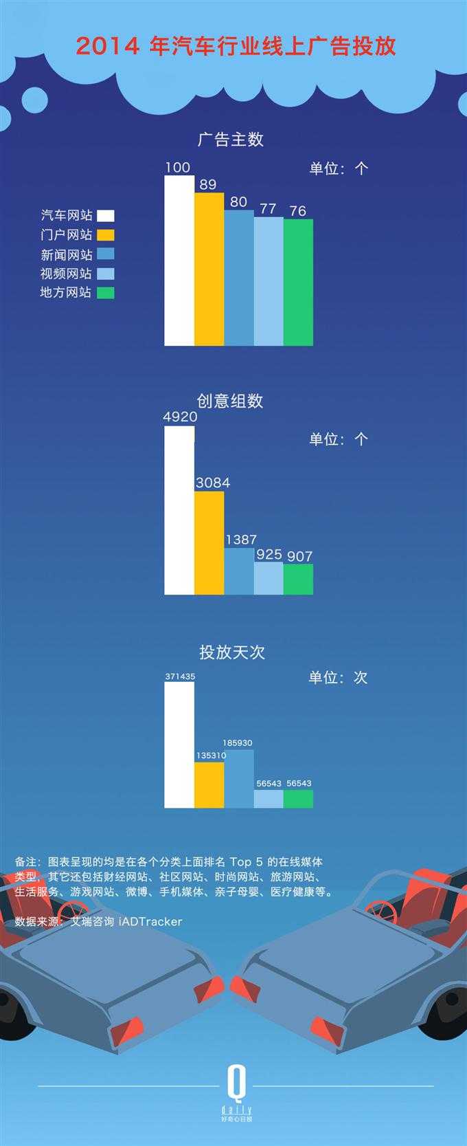 而从创意组数来看,汽车网站也是投放最多的数字媒体类型。汽车广告主2014年在线上投放了4920个创意组数,也就是说平均每天约有13.5个不同的汽车创意广告在汽车网站上上线。在广告投放天次上,汽车网站也同样是排在第一。