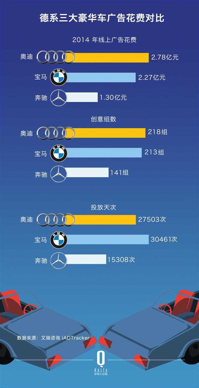 在中国豪华车市场占有80%左右市场份额的德系三大豪华车品牌:宝马、奥迪和奔驰,2014年广告花费最多的是宝马,它在尼尔森网联提供的2014传统媒体广告花费Top10汽车品牌榜单中,以15.77亿元排在第三;在艾瑞咨询提供的2014线上媒体广告花费Top10汽车品牌中,又以2.27亿元排在第四。奥迪在艾瑞咨询的这份榜单中,排在第二位。奔驰没有进入任何一个榜单,在创意组数和投放天次上,奔驰都落后于宝马和奥迪,它可能是花的最少的。