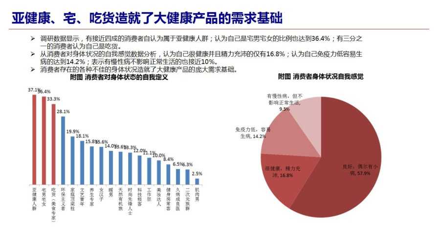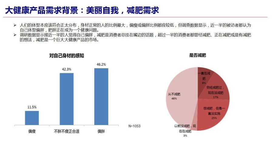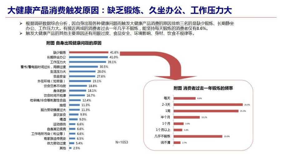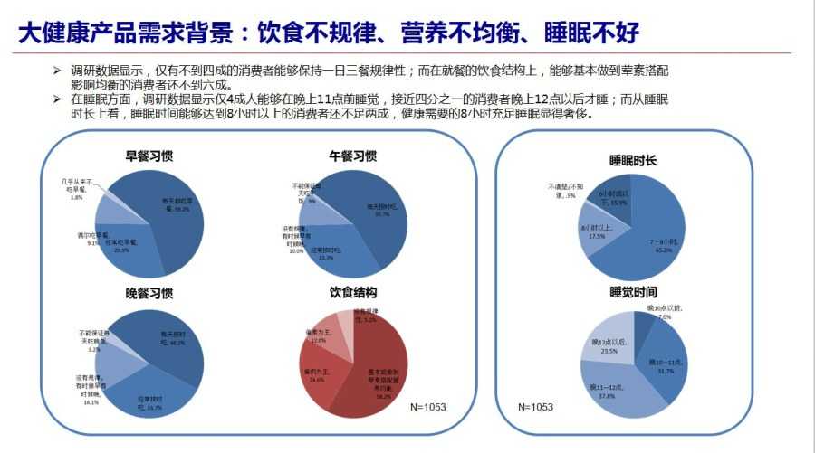 调研数据显示,有31.5%的消费者工作和生活的压力比较大,40.8%的人早晨不能按时吃早餐;44.3%的人午餐不能按时吃;53.8%的人晚餐不能按时吃;41.8%的人做不到荤素搭配营养均衡,这些都是导致大健康需求产生的原因。