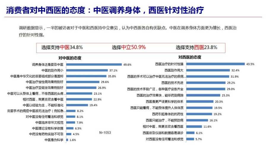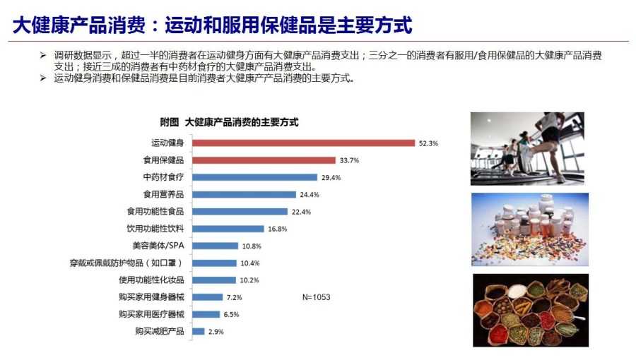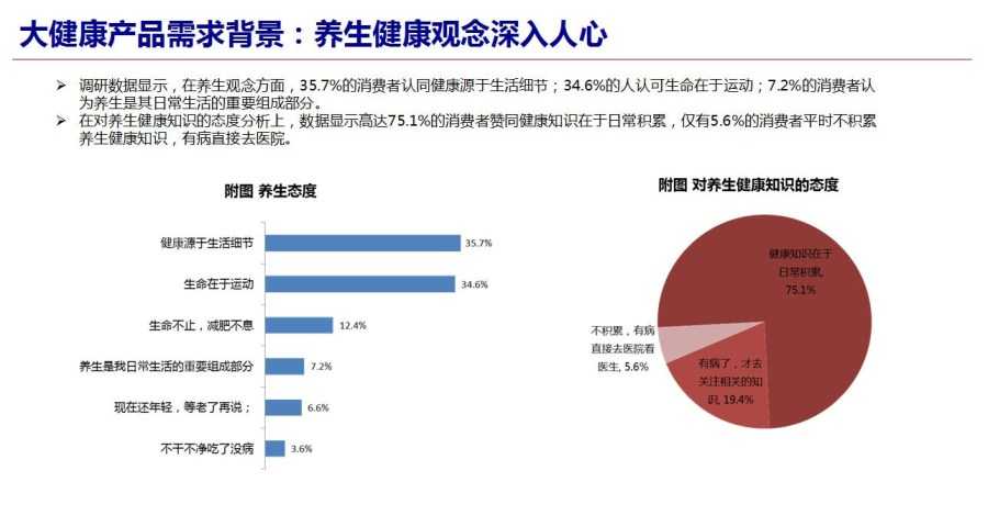 而消费者的健康意识也在自我觉醒,养生观念开始深入人心,有35.7%的人认为健康源于生活细节;34.6%的人认为生命在于运动,34.8%的人平时用中医调理身体,超过一半的消费者表示会经常检查食品中包含的营养成分。