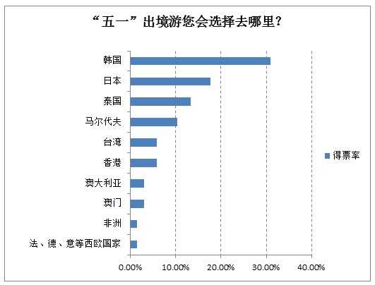 在“五一”出境游目的地意向调查中,韩国、日本、泰国、马尔代夫、台湾、香港、澳大利亚、澳门、非洲、西欧的得票率位居前十名,其中香港首次跌出前五名。《报告》认为,从去年到今年年初,日韩等国先后推出针对中国游客的签证新政,使得中国游客能够以更低的费用和更便捷的方式取得这些国家的旅游签证,这在一定程度上拉高了这些国家的得票率。另外,各大旅游网站近期推出的日、韩、泰等周边国家的出境游促销活动也是相关目的地得票率上升的重要原因。